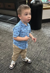 Dane has brown hair and green eyes. He wore a gray fuzzy hoodie with teddy bear ears, black pants, and blue and white shoes.